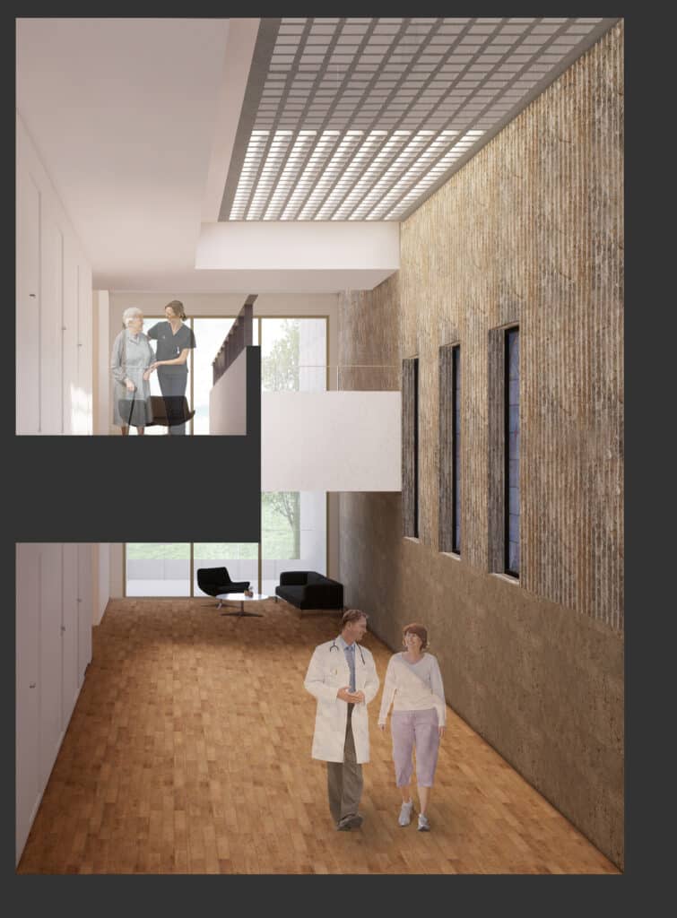 Stedenbouwkundig worden rooilijnen herijkt en verbindt een doorlopende plint de volumes. Transparantie op de hoek markeert het publieke karakter naar de wijk. Binnen kruisen zorg en kerk elkaar op meerdere plekken, met gedeelde voorzieningen en patio’s die daglicht, rust en beschutte buitenruimtes brengen. Het ontwerp is in nauwe samenspraak met beide gebruikers tot stand gekomen en vormt een zorgvuldig verweven, vanzelfsprekend geheel.