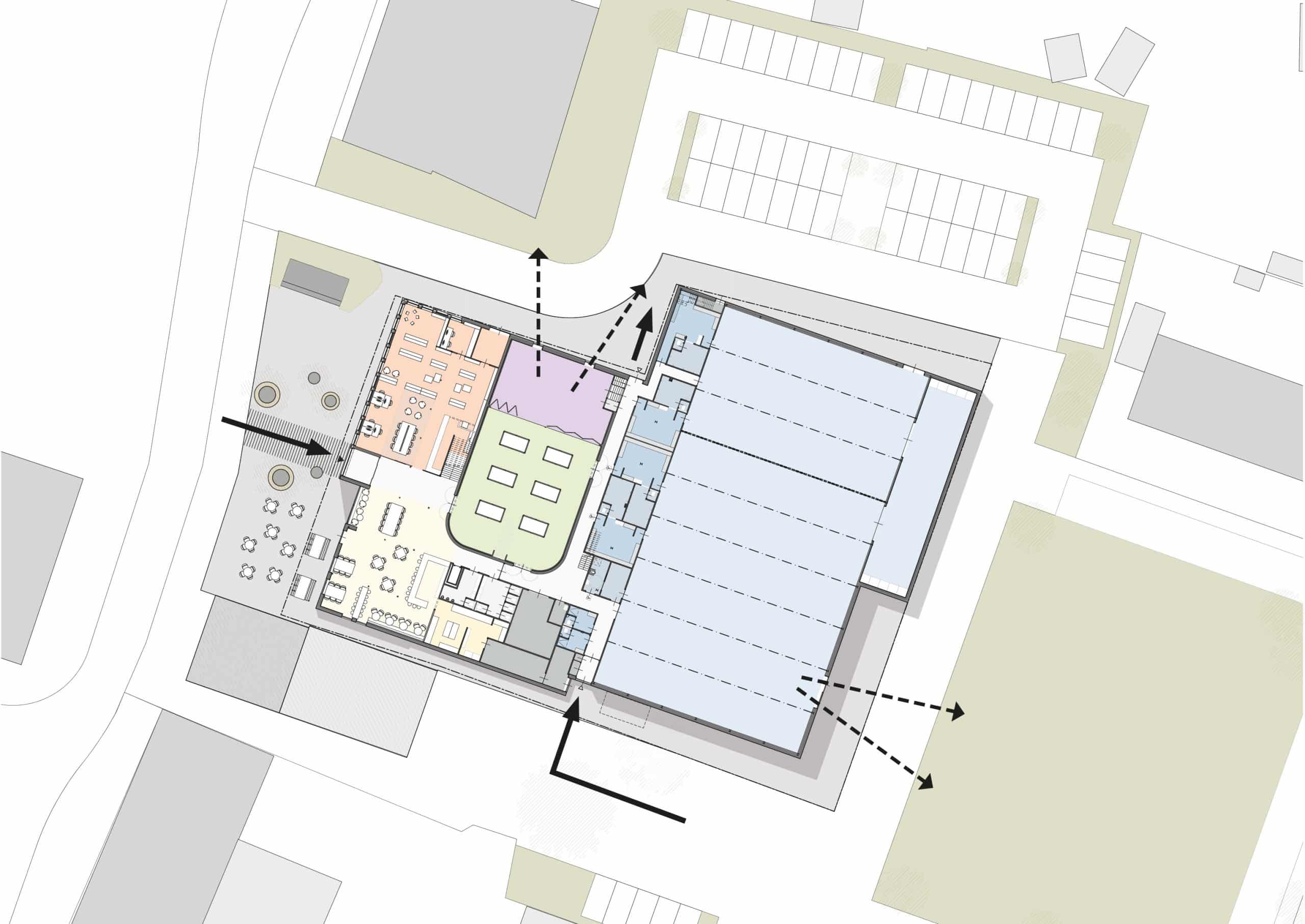 Het dorpshuis vervult een centrale sociale rol binnen de gemeenschap: een plek om samen te komen, elkaar te ontmoeten en nieuwe activiteiten te ontplooien. Aan de Kerkstraat presenteert het gebouw zich als een herkenbare blikvanger, met een representatieve en open gevel. In lijn met het stadhuis, de kerk en de pastorie richt het dorpshuis zich nadrukkelijk naar de straat en versterkt zo de wisselwerking tussen binnen en buiten. De entree sluit naadloos aan op de publieke ruimte en maakt het gebouw laagdrempelig en uitnodigend.
