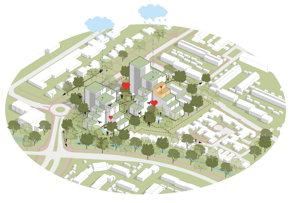 Het bestaande gebouw wordt gesloopt om ruimte te maken voor een nieuw ensemble dat zorgvuldig aansluit op de omgeving. Het plan maakt een soepele overgang van de éénlaagse particuliere patio’s naar de nieuw te bouwen hoogbouw, onder andere door het introduceren van terrassen. Deze terrassen zijn vergroend en bieden plek aan collectieve ontmoetingsruimtes, waar bewoners elkaar kunnen treffen.