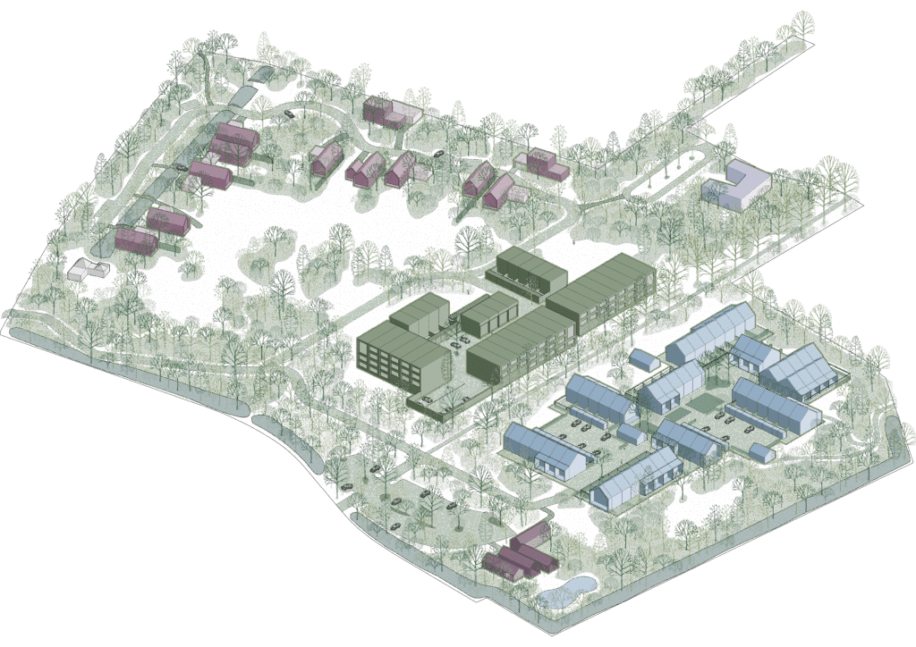 Wonen is onlosmakelijk verbonden met landschap en gemeenschap en krijgt vorm in vier woontypologieën: wonen in en rond het klooster met gestapelde en grondgebonden woningen; grondgebonden woningen in en rond de moestuin; vier vrijstaande woningen rondom de poel; en vrijstaande woningen die zorgvuldig zijn ingeweven in de bosrand.