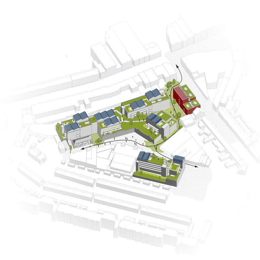 De inpassing versterkt de groenkwaliteit en creëert een leefomgeving met een sterke collectieve structuur. Een tweede, verhoogd groen maaiveld verbindt de woongebouwen en onttrekt parkeren aan het zicht, waardoor ruimte ontstaat voor ontmoeting en biodiversiteit. Via groene pockets zijn de woningen ontsloten en vormt het nieuwe maaiveld een klimaatbestendig platform voor wonen, werken en verblijven.