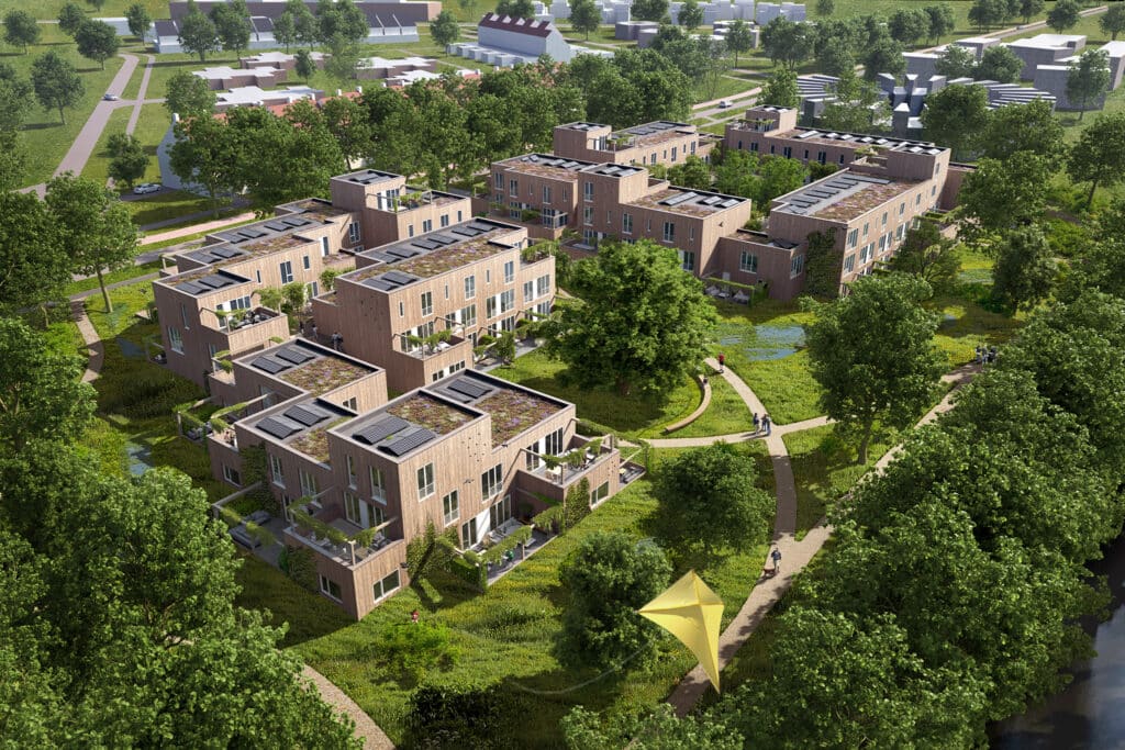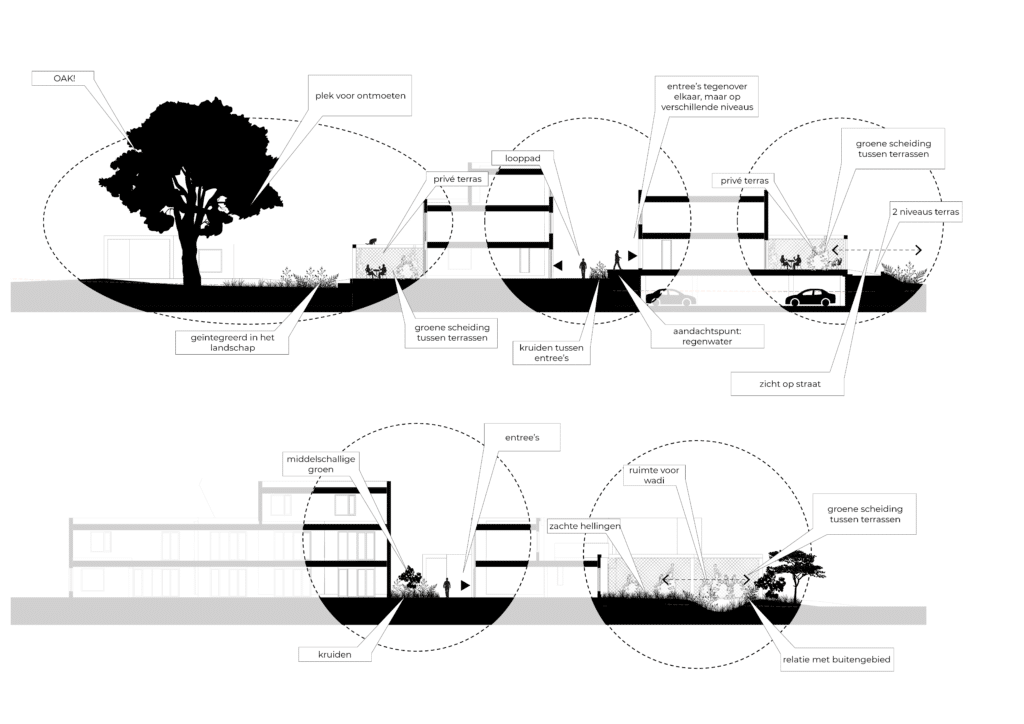 De woningen zijn opgebouwd uit modulaire houtconstructies en vormen samen een flexibel en toekomstbestendig woonmilieu. Meerdere privé-buitenruimtes, uitgevoerd als buitenkamers, liggen verspreid over verschillende lagen en oriëntaties. Zo wordt het wonen direct verbonden met natuur, licht en seizoenen en ontstaat een ecologisch ingebedde leefomgeving waarin mens en landschap elkaar versterken.